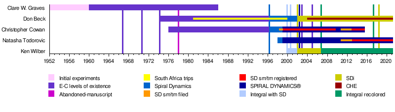 The following timeline shows the development of the various Spiral Dynamics factions and the major figures involved in them, as well as the initial work done by Graves. Splits and changes between factions are based on publications or public announcements, or approximated to the nearest year based on well-documented[18] events.