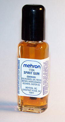 Spirit gum is an adhesive, made mostly of SD Alcohol 35-A (the solvent, or "spirit") and resin (the adhesive, or "gum") originally consisting of mastix, used primarily for affixing costume prosthetics such as wigs, merkins, or false facial hair. It has been manufactured since at least the 1870s, and has long been a standard tool in theatrical performances where prosthetic makeup or affixed costuming is used. It was mentioned in the earliest known published theatre makeup manual: "How to make-up; a practical guide for amateurs by Haresfoot and Rouge" in 1877.[1] At the end of the nineteenth century, spirit gum could be procured by performers at theatrical wig makers and it was removed with alcohol, cocoa butter or vaseline.[2]
