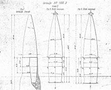 A new Spitzgeschoß aerodynamic bullet, credited to the independent ballistician Arthur Gleinich, was tested in 1902 and officially adopted on 3 April 1903. After several shape revisions it entered mass production in 1904. The Spitzgeschoß nose was externally pointed like the French design and its shape was patented, but the full metal jacket Spitzgeschoß differed internally.[5][6][7] The Gewehr-Prüfungskommission program resulted in the S Patrone or 7.92×57mm Mauser cartridge, which was loaded with a relatively lightweight 9.9 grams (153 gr) spitzer bullet with a slightly increased diameter of 8.2 mm (0.323 in) that had a ballistic coefficient (G1 BC) of approximately 0.321 to 0.337 (ballistic coefficients are somewhat debatable), along with a dimensionally redesigned chambering and bore (designated as "S-bore") and new double-base (based on nitrocellulose and nitroglycerin) smokeless powder loading, which delivered a greatly improved muzzle velocity of 878 m/s (2,880 ft/s) from a 740 millimetres (29.1 in) barrel. The S Patrone was adopted by the German Army and Navy in 1903 and had a maximum range of approximately 3,700 m (4,050 yd).[8][9] The combination of increased muzzle velocity and improved bullet aerodynamics provided a much flatter bullet trajectory, which increased the probability of hitting an individual target at most typical combat distances.