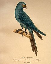 In 1638 Georg Marcgrave was the first European naturalist to observe and describe the species; however, it is named for Johann Baptist von Spix, who collected the type specimen in April 1819 in Brazil, but gave it the misnomer Arara hyacinthinus not realizing till later that the name collided with Psittacus hyacinthinus, the name assigned to the hyacinth macaw described by John Lathan in 1790.[8] Spix's mistake was noticed in 1832 by German Professor of Zoology Johann Wagler, who realized that the 1819 specimen was smaller and a different color than the hyacinth macaw and he designated the new species as "Sittace spixii". It wasn't until 1854 that naturalist Prince Charles Bonaparte properly placed it in its own genus, designating the bird Cyanopsitta spixi [sic],[9] based on important morphological differences between it and the other blue macaws.[10] It was listed as Cyanopsittacus spixi [sic] by Italian zoologist Tommaso Salvadori in his 1891 Catalog of the Birds in the British Museum.[11]