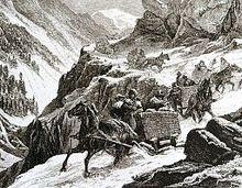 A few years ago, there was no path except across this mountain, which being very exposed, and difficult even to danger, the Splugen was only traversed by shepherds and travellers of the country on mules or on foot. But now, a new and most marvellous road has been constructed - the mountain in question is, to the extent of several miles, cleft from the summit to the base, and a sheer precipice of 4000 feet rises on either side. The Rhine, swift and strong, but in width a span, flows in the narrow depth below. The road has been constructed on the face of the precipice, now cut into the side, now perforated through the living rock into galleries: it passes, at intervals, from one side of the ravine to the other, and bridges of a single arch span the chasm. The precipices, indeed approach so near, in parts, that a fallen tree could not reach the river below, but lay wedged in mid-way. It may be imagined how singular and sublime this pass is, in its naked simplicity. After proceeding about a mile, you look back and see the country you had left, through the narrow opening of the gigantic crags, set like a painting in this cloud-reaching frame. It is giddy work to look down over the parapet that protects the road, and mark the arrowy rushing of the imprisoned river. Mid-way in the pass, the precipices approach so near that you might fancy that a strong man could leap across."[3]