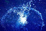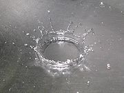 In fluid mechanics, a splash is a sudden disturbance to the otherwise quiescent free surface of a liquid (usually water). The disturbance is typically caused by a solid object suddenly hitting the surface, although splashes can occur in which moving liquid supplies the energy. This use of the word is onomatopoeic; in the past plash has been used. Splash also happens when a liquid droplet impacts on a liquid or a solid surface. In this case, a symmetric corona is usually formed as shown in Harold Edgerton's famous milk splash photography. Historically, Worthington (1908) was the first one who systematically investigated the splash dynamics using photographs.