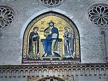 The façade is divided into three bands. The lower one has a fine architraved door with sculpted door-posts. Two pulpits are provided on each side of the porch. The upper bands are separated by rose windows and ogival arches. The most striking feature of the upper façade is the Byzantine-hieratic mosaic portraying Christ giving a Benediction, signed by one Solsternus (1207). He signed his work with the inscription "Doctor Solsternus, hac summus in arte modernus" (doctor Solsternus, supremely modern in his art ), calling himself an outstanding modern artist. Nothing else is known about him. He was certainly ahead of his contemporaries, because it would take half a century before the mosaics in Roman churches would surpass his style. The part of the belfry contemporary with the church reuses Roman and early medieval elements.