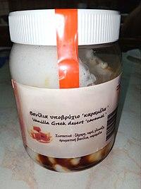 One typically Greek spoon sweet is the snow-white and intensely aromatic vaníllia (βανίλια, [va'nilja]) which is not made of vanilla, but of mastic resin, for which the Aegean island of Chios is famous. This is usually served as a spoonful of sweet on a table spoon dropped into a tall glass of ice-cold water and popularly called "βανίλια υποβρύχιο", a "vanilla submarine". It is a thick, white, sweet paste made industrially by beating mastic resin with table sugar. When cold, it has the consistency of hard caramel candy: it is meant to be licked like a lollipop as, at body temperature, it gradually becomes softer and more chewable. The Greek diaspora introduced this treat to other countries as far away as Japan.[1]