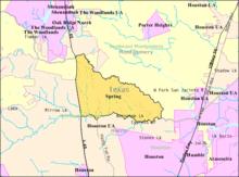 Spring is a census-designated place (CDP) within the extraterritorial jurisdiction of Houston in Harris County, Texas, United States, part of the Houston–The Woodlands–Sugar Land metropolitan area.[3] The population was 54,298 at the 2010 census.[4] While the name "Spring" is popularly applied to a large area of northern Harris County and a smaller area of southern Montgomery County, the original town of Spring, now known as Old Town Spring, is located at the intersection of Spring-Cypress and Hardy roads and encompasses a relatively small area of perhaps 1 square kilometre (0.39 sq mi).