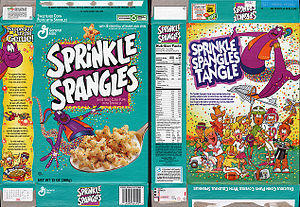 Sprinkle Spangles was a short-lived breakfast cereal by General Mills. It was introduced in the mid 90s, alongside Hidden Treasures. The cereal was of star-shaped pieces covered with multi-colored sprinkles. The commercials claimed that they "Spangled every angle with sprinkles." Sprinkle Spangles were no longer available in 1998.