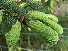 Spruce or other evergreens have sometimes been used as a flavoring ingredient in beer, such as Alba Scots Pine Ale,[11] the Alaskan Brewing Company's Winter Ale, Beau's Brewery's Spruce Moose Pale Ale,[12] and Yards Brewing Company's Poor Richard's Tavern Spruce.[13] Banded Brewing in Biddeford, Maine brews a pale ale named Greenwarden[14] every spring with Maine foraged white spruce tips. Portsmouth New Hampshire's Earth Eagle Brewings combines locally foraged pine and spruce tips in their seasonal Connie Ferale amber. Tamworth Distilling in Tamworth, New Hampshire distills a spruce gin from foraged spruce tips also.