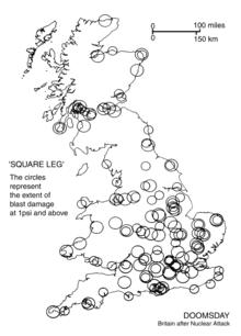 Square Leg was a 1980 British government home defence Command Post and field exercise, which tested the Transition to War and Home Defence roles of the Ministry of Defence and British government. Part of the exercise involved a mock nuclear attack on Britain. It was assumed that 131 nuclear weapons would fall on Britain with a total yield of 205 megatons (69 ground burst; 62 air burst)[1] with yields of 500 KT to 3 MT[2] That was felt to be a reasonably realistic scenario, but the report stated that a total strike in excess of 1,000 megatons would be likely.