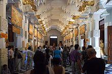 During the reign of Dharmapala of Kotte, the relic was kept hidden in Delgamuwa Vihara, Ratnapura, in a grinding stone.[2] It was brought to Kandy by Hiripitiye Diyawadana Rala and Devanagala Rathnalankara Thera. King Vimaladharmasuriya I built a two-storey building to deposit the tooth relic and the building is now gone.[3] In 1603 when the Portuguese invaded Kandy, it was carried to Meda Mahanuwara in Dumbara. It was recovered in the time of Rajasinha II and it has been reported that he reinstated the original building or built a new temple.[2] The present-day temple of the tooth was built by Vira Narendra Sinha.[4] The octagonal Paththirippuwa and moat were added during the reign of Sri Vikrama Rajasinha. The royal architect Devendra Moolacharya is credited with building the Paththirippuwa. Originally it was used by the king for recreational activities and later it was offered to the tooth relic, it now houses the temple's library.