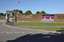 St Athan (Welsh: Sain Tathan) is a village and community in the Vale of Glamorgan in South Wales. The village and its parish church are dedicated to Saint Tathan. The church dates to the 13th–14th century, though an earlier church was dated to the Norman period. The village and the adjacent dormitory village of Eglwys Brewis are known primarily for the MOD St Athan RAF base. There is one pub in the village, as well as a football team at St Athan Football Club and the St Athan Golf Club.[2] The community includes West Aberthaw.