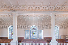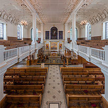 St Botolph's was completely rebuilt between 1741[12] and 1744, to a design by George Dance the Elder.[3] The exterior is of brick with projecting quoins, stone windows surrounds and a stone cornice. The tower, also of brick, has rusticated quoins, and a stone spire.[13] The interior of the building is divided into nave and aisles by four widely spaced piers[14] supporting a flat ceiling. There are galleries along three sides. The church is lit by two rows of windows in each side wall, one above and one below the gallery.[13] The monuments from the old building were preserved, and reinstalled in the new church.[14]
