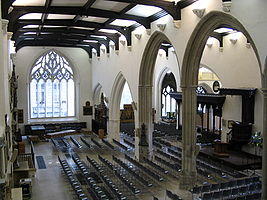 Although it is thought that a Roman or a Saxon building might have stood on the site, the first mentions of the parish church of St Helen date back to the mid-12th century. In 1210, the Dean and chapter of St. Paul's gave William, son of William Goldsmith, permission to establish a priory of Benedictine nuns, and a nunnery was built alongside the existing church.[4] The new church was four feet wider than the parish church, and longer too, so the parish church was lengthened to match. The masonry of the outer walls as it currently stands was in place by 1300.[5][6] The church was divided in two by a partition running from east to west, the northern half serving the nuns and the southern the parishioners. In 1480, four great arches were installed between the nun's choir and the parishioner's nave, and a wooden screen was put in place to separate the two. An additional screen was placed in the parish church to separate the chancel in the east end of the church, where the altar was located, from the nave.