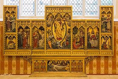 During the Victorian era, two significant restorations were carried out. The first, in 1865, provided the two stone tracery windows on the east end of the church and stained glass throughout the building. The second, more significant, Victorian restoration was carried out from 1891 to 1893 by John Loughborough Pearson under supervision of the then rector, Rev. John Alfred Lumb Airey. This restoration was inspired by the Oxford movement, which advocated moving the centre of importance in the church from preaching to the sacrament of the Eucharist. This new arrangement resulted in a new floor with levels gradually ascending from the west to a new high altar in the east, completed by an ornated reredos and marble pavement, once again enclosed in a chancel by a neo-Gothic screen. The organ was expanded and moved to the south transept, where two additional altars were also placed in two side chapels, the Chapel of the Holy Ghost and the Chapel of our Lady. The church was reopened on St John the Baptist's Day in 1893 by the Bishop of London, Frederick Temple.