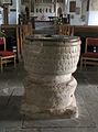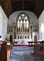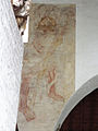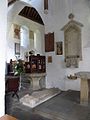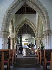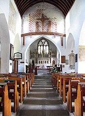 Architectural features of East church include squints (hagioscopes), stone benches, a carved stone reredos, and roof level markings on the tower, which tell the story of development in the East church.[13] Other features of interest in the East chapel are the medieval wall paintings, which include the Royal Standard of King James c. 1604, St. Christopher (c.1400) and those of Mary Magdalene and the Virgin Mary on the walls of the Chancel.[13]
