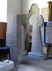 The Sampson Cross is 2.15 meters high, and was probably once capped by a wheel cross, which is now missing. It is inscribed on the west and east faces. The West inscription reads: +SAMSON POSUIT HANC CRUCEM + PRO ANIMA EIUS +, or, "Samson placed his cross for his soul." The east face reads: + ILTUTI SAMSON REGIS SAMUEL + EBISAR +, or, "(For the soul of) Illtud, Samson the King, Samuel Ebisar."[36][38] This cross originally lay in the churchyard near the path on the north side of the church. When it was raised to bring it indoors, two skeletons were found beneath it.[38]