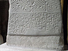The Sampson Pillar, sometimes known as the "King's Stone,"[19] is 2.75 meters high and badly eroded, but once bore an inscription bearing the name of Sampson the Abbot (identity unknown), Artmail (another abbot) and Ithel, a 9th-century king of Gwent.[36] Its inscription reads: IN NOMINE DI SUMMI INCIPIT CRUX SALVATORIS QUAE PREPARAVIT SAMSONI ABATI PRO ANIMA SUA ET PRO ANIMA *IUTHAHELO REX ET ARTMAIL ET TECAN, or "In the name of the most high God begins the cross of the Saviour which Samson the Abbot prepared for his soul, and for the soul of Iuthahelo the King and of Artmail and of Tecan." Iuthahelo is thought to be Ithel, a king of Gwent who died in 846.[38]