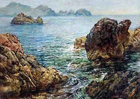 In 1883, Pierre-Auguste Renoir spent the summer in Guernsey, with a varied landscape of beaches, cliffs and bays, where he created fifteen paintings in little over a month. Most of these feature Moulin Huet, a bay in Saint Martin. These paintings were the subject of a set of commemorative postage stamps issued by the Bailiwick of Guernsey in 1983.
