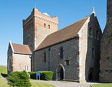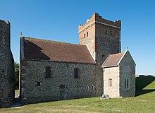 Whether or not it had a predecessor, the present Saxon church was built on the Eastern Heights around AD1000. It is immediately adjacent to the surviving eastern pharos, which was used as a source of spolia: Roman tiles can be still be seen in the church fabric, particularly in the window arches (usually of stone), and flint and tile from the pharos is used throughout the church's walls.[4] The plinth that projects out from beneath the church and on which it stands, however, is of new stone. The church is cruciform with a central tower the same width as the nave but broader than the chancel and transepts.[4] The nave has no aisles. The door arch is the earliest to survive in any standing church in England.