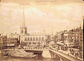 The first church was founded before 1154, with a chancel extending over the south gate of the city. The gate and old church were demolished to make way for the rebuilding of Bristol Bridge, and the church was rebuilt in 1762–1769 by James Bridges and Thomas Paty, who rebuilt the spire. Part of the old church and town wall survives in the 14th-century crypt.[1]