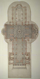 Wren had begun advising on the repair of the Old St Paul's in 1661, five years before the fire in 1666.[20] The proposed work included renovations to interior and exterior to complement the classical facade designed by Inigo Jones in 1630.[21] Wren planned to replace the dilapidated tower with a dome, using the existing structure as a scaffold. He produced a drawing of the proposed dome which shows his idea that it should span nave and aisles at the crossing.[22] After the Fire, it was at first thought possible to retain a substantial part of the old cathedral, but ultimately the entire structure was demolished in the early 1670s.