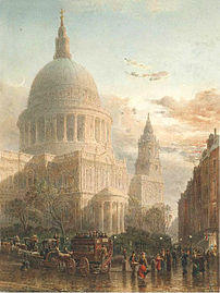 The task of designing a replacement structure was officially assigned to Sir Christopher Wren on 30 July 1669.[18] He had previously been put in charge of the rebuilding of churches to replace those lost in the Great Fire. More than 50 City churches are attributable to Wren. Concurrent with designing St Paul's, Wren was engaged in the production of his five Tracts on Architecture.[19]