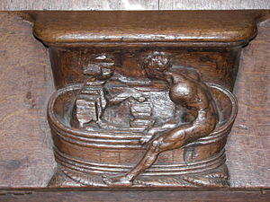 The wooden choir stalls (16th–17th century), from the reigns of François I and Henri II, are richly carved with scenes of daily life, the different professions, and grotesque animals. Out of sight from those attending mass, they were designed as a place where the Canons of the church could relax during the service. Some of the figures were too intimate for more puritanical later centuries, and had to be censored, including a carved image of a man and woman bathing together.[8]