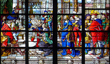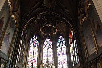 The chapel of the Virgin, at the back of the church, has a dramatic late gothic vaulted ceiling, featuring a hanging crown of stone 2.5 meters in diameter, and abstract designs resembling flames. The room is often used for silent meditation by church visitors. The chapel has some of the oldest stained glass windows in the flamboyant gothic style, made by Jean Chastellain in 1517, illustrating the life of the Virgin Mary. [8] Another remarkable window by Chastellain, "The Judgement of Solomon", made in 1533 in the colorful Renaissance style, is found in a side chapel.