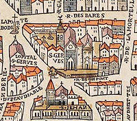 A church dedicated to Saints Gervasius and Protasius, two Christian martyrs from Milan, is recorded as existing on the site in the 7th century, making it one of the first parish churches on the right bank in Paris. It was attended mostly by boatmen and fishermen, because it was close to the river port at the Place de Grève. It was built on a slight hill, the Monceau Saint-Gervais, to be safe from the floods of the Seine. After the completion of the wall of Philippe-Auguste, built between 1190 and 1209, the neighborhood was protected against attack and the population began to grow. The church had come under the sponsorship of several of the important confreries or guilds of Paris, including the wine-merchants. With their financial help, a larger church was built on the site in the early 13th century. .[1]
