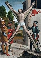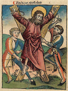 Andrew is said to have been martyred by crucifixion at the city of Patras (Patræ) in Achaea, in AD 60.[13] Early texts, such as the Acts of Andrew known to Gregory of Tours,[16] describe Andrew as bound, not nailed, to a Latin cross of the kind on which Jesus is said to have been crucified; yet a tradition developed that Andrew had been crucified on a cross of the form called crux decussata (X-shaped cross, or "saltire"), now commonly known as a "Saint Andrew's Cross" — supposedly at his own request, as he deemed himself unworthy to be crucified on the same type of cross as Jesus had been.[b] The iconography of the martyrdom of Andrew — showing him bound to an X-shaped cross — does not appear to have been standardized until the later Middle Ages.[17][c]