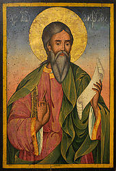 Andrew the Apostle (Greek: Ἀνδρέας Andreas; Aramaic: ܐܢܕܪܐܘܣ[3]), also called Saint Andrew, was an apostle of Jesus according to the New Testament. He is the brother of Saint Peter.[4] He is referred to in the Orthodox tradition as the First-Called (Greek: Πρωτόκλητος, Prōtoklētos).