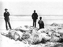 Between January 9 and January 15, a storm tide dragged the carcass out to sea, but it washed ashore again on the next tide, on Crescent Beach, two miles to the south of its original location. Webb sent photographs of the mass, along with a description, to Joel Asaph Allen of the Museum of Comparative Zoology at Harvard. Allen apparently did not respond, but Webb's letter came to the attention of Prof. Addison Emery Verrill of Yale, at that time the foremost authority on cephalopods in the country. At first, Verrill suggested the carcass might represent the remains of a giant squid. In the January 1897 issue of the American Journal of Science he wrote:[6]
