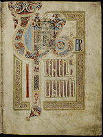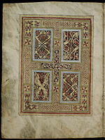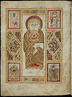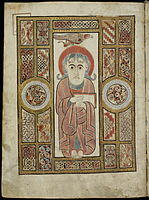 The manuscript contains the four gospels in the form of an Irish hybrid which draws on both Vetus Latina and the Vulgate. Striking from an artistic perspective are the facing pages with which each gospel begins. Each pair consists of an impressive portrait of the evangelist on the left and beautifully crafted incipit on the right.[4] The equilibrium of these double-page compositions is one of the supreme accomplishments of Irish book art. The same quality is evident in a carpet page (p. 6), another decorative initial (p. 7), and depictions of the Crucifixion (p. 266) and the Last Judgment (p. 267) at the end of the book.[4] The initial pages for the Gospels of Mark and John (pp. 78/79 and 208/209) differ in style from the others, so it can be assumed that two different illuminators were at work.[4]