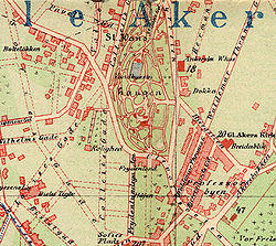 To the southeast of the park is Oslo’s oldest building – Aker Kirke, built around 1100, but restored from ruins around 1860, and then again in the 1950s in a more authentic style. Next to the church is the cemetery Vår Frelsers gravlund, created in 1808 as a result of the great famine and cholera epidemic of the Napoleonic Wars. The nearby area around Damstredet and Telthusbakken is interesting since it retains the small town character of Oslo in the first part of the 19th century.