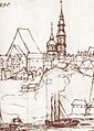 The cathedral was rebuilt after the war. The exterior reconstruction is based on the 14th-century church's presumed appearance (according to an early-17th-century Hogenberg illustration and a 1627 Abraham Boot drawing), not on its prewar appearance.