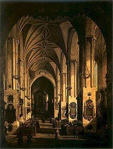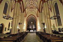 The interior reconstruction design considerably differed from the pre-war Cathedral, taking it back in time to its raw Gothic look, because very little of the cathedral's original furnishings has been preserved. The Cathedral is a three-nave building, two aisles are the same height as the main nave. On the right side from the front a belfry is situated, a passage to Dziekania Street is situated underneath it. There is a pulpit from 1959, designed by Józef Trenarowski and stalls which are a replica of the destroyed baroque ones, founded by King John III Sobieski.[3] Moreover, there are many chapels, gravestones and epitaphs in the Cathedral. By the left aisle are numerous chapels. They are, in turn, from the main altar: