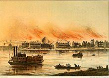 The St. Louis Fire of 1849 was a devastating fire that occurred on May 17, 1849 and destroyed a significant part of St. Louis, Missouri and many of the steamboats using the Mississippi River and Missouri River.[1] This was the first fire in United States history in which it is known that a firefighter was killed in the line of duty. Captain Thomas B. Targee was killed while trying to blast a fire break.[1]