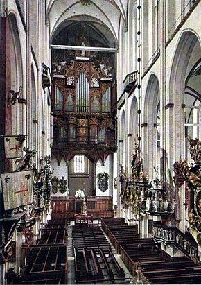 At the same time, a treasure chamber was made for the Danzig Parament Treasure from St. Mary's Church in Danzig (now Gdańsk), which came to Lübeck after the War (removed in 1993), the Parament Treasure is now exhibited at St. Anne's Museum), and above that a large organ loft was built. The organ itself was not installed until 1968.