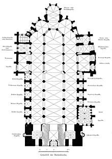 It is built as a three-aisled basilica with side chapels, an ambulatory with radiating chapels, and vestibules like the arms of a transept. The westwork has a monumental two-tower façade. The height of the towers, including the weather vanes, is 124.95 metres (409.9 ft) and 124.75 metres (409.3 ft), respectively.