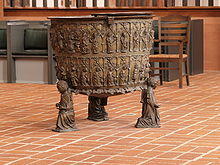 - A bronze baptismal font made by Hans Apengeter (1337). Until 1942 it was at the west end of the church; it is now in the middle of the chancel. It holds 406 litres (89 imperial gallons; 714 imperial pints), almost the same as a Hamburg or Bremen beer barrel, which holds 405 litres (89 imperial gallons; 713 imperial pints).[9]