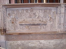 - In the ambulatory, sandstone reliefs (1515) from the atelier of Heinrich Brabender, with scenes from the Passion of Christ: to the north, the Washing of the Feet and the Last Supper; to the south, Christ in the garden of Gethsemane and his capture. The Last Supper relief includes a detail associated with Lübeck: a little mouse gnawing at the base of a rose bush. Touching it is supposed to mean that the person will never again return to Lübeck – or will have good luck, depending on the version of the superstition.
