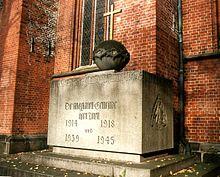The glass window in one of the chapels has an alphabetic list of major towns in the pre-1945 eastern territory of the German Reich. Because of the destruction it suffered in World War II, St. Mary's Church is one of the Cross of Nails centres. A plaque on the wall warns of the futility of war.