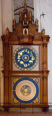 The astronomical clock was built in 1561–1566. It used to stand in the ambulatory, behind the high altar but was completely destroyed in 1942. Only a clock dial that was replaced during a previous restoration remains, in St. Anne's Museum The new Astronomical Clock, which was installed on the East side of the Northern transept, in the Danse Macabre Chapel. It is the work of Paul Behrens, a Lübeck clockmaker, who planned it as his lifetime achievement from 1960 to 1967. He collected donations for it, made the clock, including all its parts, and maintained the clock until his death. The clock front is a simplified copy of the original. Calendar and planetary discs controlled by a complicated mechanical movement show the day and the month, the position of the sun and the moon, the signs of the zodiac (the thirteen astronomical signs, not the twelve astrological signs), the date of Easter, and the golden number.