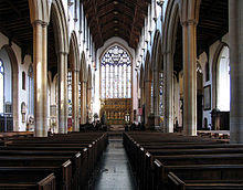 It has a Norman foundation dating from 1075, a 1463 font, a 1573 Flemish tapestry and medieval glass. The North transept displays a remarkable collection of church silver (one of the finest of any parish church in the country) including the Gleane and Thistle cups, as well as memorabilia associated with its most famous parishioner, the physician-philosopher Thomas Browne, author of Religio Medici (1642).[4] The small lead-covered spire with flying buttresses was added by A.E. Street in 1896.[2]