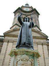 Six of the monuments have heritage listings, including one commemorating two men who died during the construction of Birmingham Town Hall and a memorial to the victims of the Birmingham pub bombings. Thomas Stirling Lee's statue of Charles Gore, vested in convocation robes with his right hand raised in blessing, is located at the West entrance. A large Portland stone obelisk commemorates Frederick Gustavus Burnaby. Besides Burnaby's bust, in relief, it carries only the word "Burnaby", and the dated place names "Khiva 1875" and "Abu Klea 1885". These refer to the Khanate of Khiva and Battle of Abu Klea, respectively; he was killed at the latter.[6] The obelisk was unveiled by Lord Charles Beresford on 13 November 1885.[7] An earlier red marble was erected in 1857 to commemorate the life and death of Lieutenant-Colonel Thomas Unett, who died leading his men during the Siege of Sevastopol.[8] Upon completion of the Burnaby building, it was decided to prohibit monuments from being added to the interior.[2]