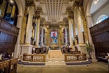 The original shallow eastern apse was extended in 1884–88 by J. A. Chatwin into a much larger chancel,[4] articulated by strongly projecting Corinthian columns. This bold design is made richer by the marbled surfaces of the columns and pilasters, the gilding of capitals and cornice and the ornately coffered ceiling. Chatwin also refaced the exterior of the building because the stone from the original quarry was very soft.[4] The tower was refaced in 1958-59.