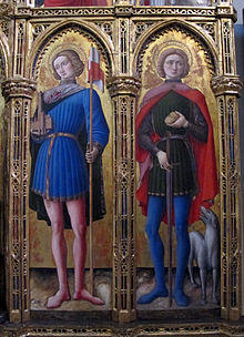 Saint Roch or Rocco (lived c. 1348 – 15/16 August 1376/79 (traditionally c. 1295 – 16 August 1327[2]) is a Catholic saint, a confessor whose death is commemorated on 16 August and 9 September in Italy; he is specially invoked against the plague. He may also be called Rock in English, and has the designation of St Rollox in Glasgow, Scotland, said to be a corruption of St Roch's Loch, which referred to a small loch once near a chapel dedicated to St. Roch in 1506.[3][4]