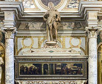 We know for certain that the body of St. Roch was carried from Voghera, instead of Montpellier as previously thought, to Venice in 1485. Pope Alexander VI (1492–1503) built a church and a hospital in his honor. Pope Paul III (1534–1549) instituted a confraternity of St. Roch. This was raised to an arch-confraternity in 1556 by Pope Paul IV; it still thrives today.[17] Saint Roch had not been officially recognized as yet, however. In 1590 the Venetian ambassador at Rome reported back to the Serenissima that he had been repeatedly urged to present the witnesses and documentation of the life and miracles of San Rocco, already deeply entrenched in the Venetian life, because Pope Sixtus V "is strong in his opinion either to canonize him or else to remove him from the ranks of the saints;" the ambassador had warned a cardinal of the general scandal that would result if the widely venerated San Rocco were impugned as an impostor. Sixtus did not pursue the matter but left it to later popes to proceed with the canonization process.[18] His successor, Pope Gregory XIV (1590–1591), added Roch of Montpellier, who had already been memorialized in the Holy Sacrifice of the Mass for two centuries, to the Roman Catholic Church Martyrology, thereby fixing August 16 as his universal feast day.[19]