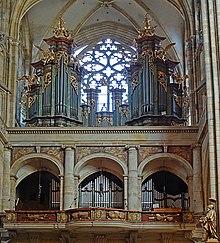 The St. Vitus Cathedral has two organ casings. The upper façade belonged to a baroque organ, which was built in 1765 by Anton Gartner. It had 40 stops on 3 manuals and pedals. This case is purely decorative. The associated work was transported around 1909 and was lost.
