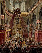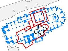 Construction of the present-day Gothic Cathedral began on 21 November 1344, when the seat of Prague was elevated to an archbishopric. King John of Bohemia laid the foundation stone for the new building.[3] The patrons were the chapter of cathedral (led by a Dean), the Archbishop Arnost of Pardubice, and, above all, Charles IV, King of Bohemia and a soon-to-be Holy Roman Emperor, who intended the new cathedral to be a coronation church, family crypt, treasury for the most precious relics of the kingdom, and the last resting place cum pilgrimage site of patron saint Wenceslaus. The first master builder was a Frenchman Matthias of Arras, summoned from the Papal Palace in Avignon. Matthias designed the overall layout of the building as, basically, an import of French Gothic: a triple-naved basilica with flying buttresses, short transept, five-bayed choir and decagon apse with ambulatory and radiating chapels. However, he lived to build only the easternmost parts of the choir: the arcades and the ambulatory. The slender verticality of Late French Gothic and clear, almost rigid respect of proportions distinguish his work today.