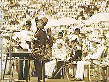 On 16 September 1963, the stadium was the site of the proclamation of the formation of the Malaysia Federation. The event was witnessed by more than 30,000 audience[33] and it was attended by the Yang di-Pertuan Agong, the Malay rulers, the Governor of Penang, Malacca, Singapore, Sarawak and Sabah, as well as the cabinet members, foreign diplomats and invited guests.[34] The Proclamation of Malaysia, which was handed by the Yang di-Pertuan Agong,[35] was read out by the Prime Minister, Tunku Abdul Rahman. He then shouted "Merdeka" seven times, which was echoed by the crowd. This was followed by the playing of the nobat orchestra and the national anthem played by the Royal Malaysia Police Band. It was then followed by a 101-gun salute by the first round of the Federation artillery.[36] The event ended with the prayer by the Mufti of Negeri Sembilan, Ahmad Mohammad Said.[37]